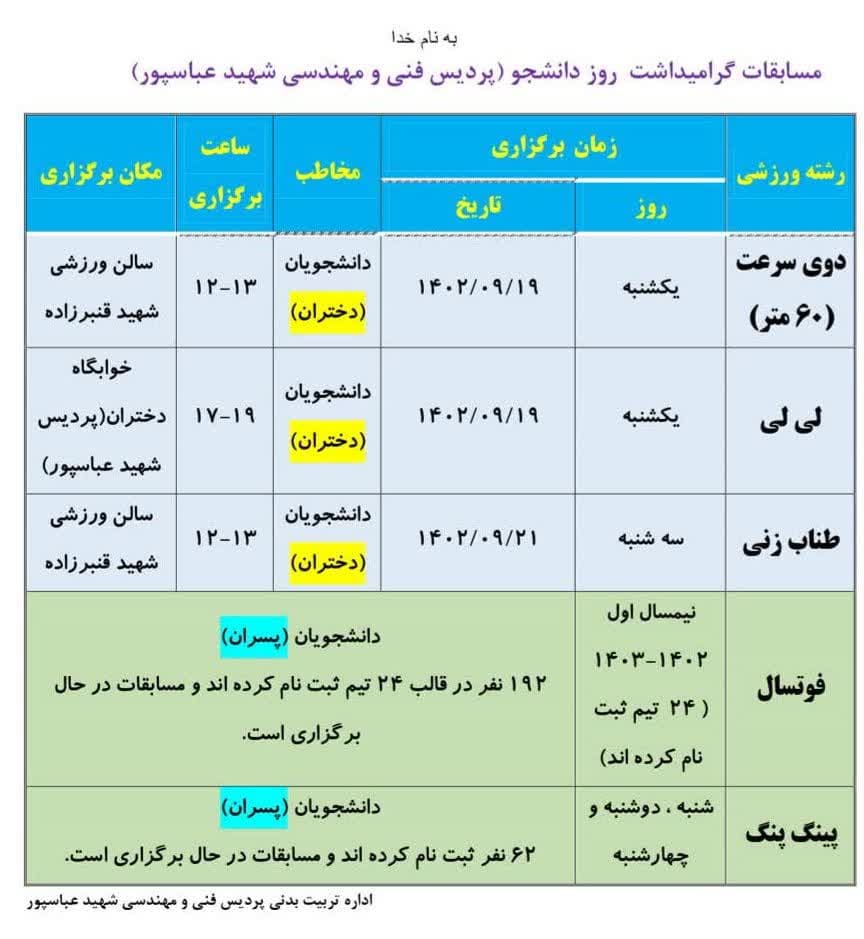 به همت اداره تربیت بدنی و مشارکت کانون فرهنگی ورزشی ایثار و پایگاه بسیج شهید خدابنده، روز چهارشنبه 3 آبان 1402 به مناسبت گرامیداشت هفته تربیت بدنی پیاده روی با حضور دکتر زندی (رییس پردیس فنی و...