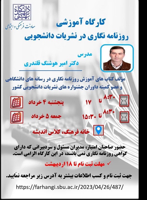 مدرس دوره: جناب آقای دکتر امیرهوشنگ قلندری مولف کتابهای "روزنامهنگاری در نشریات دانشجویی" "اصول و مبانی نشریات دانشگاهی" و عضو کمیته داوران جشنوارههای نشریات دانشجویی کشور