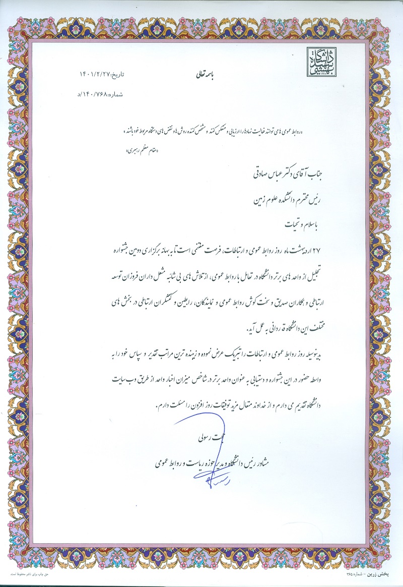 از دانشکده علوم زمین در دومین جشنواره روابط عمومی دانشگاه، تقدیر شد